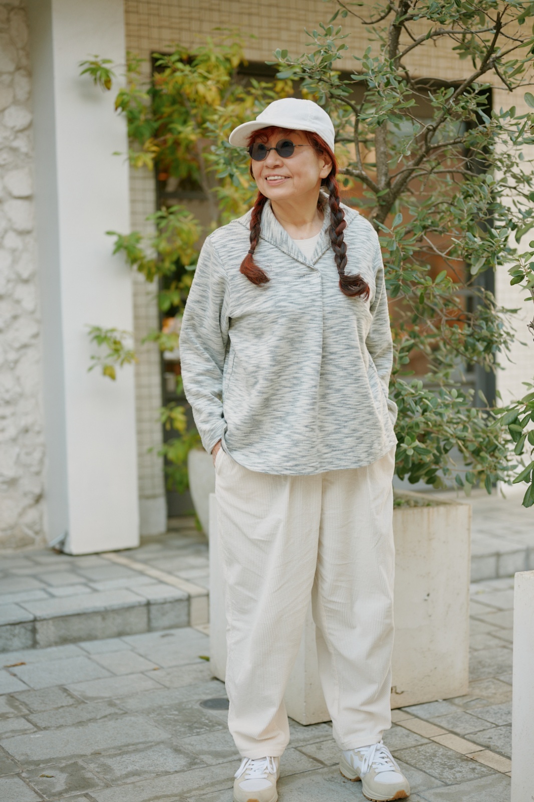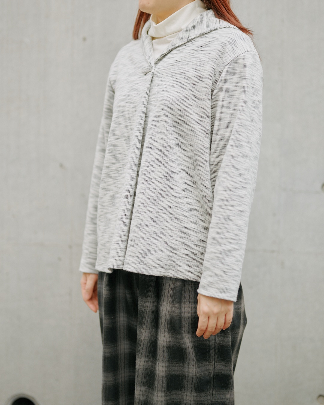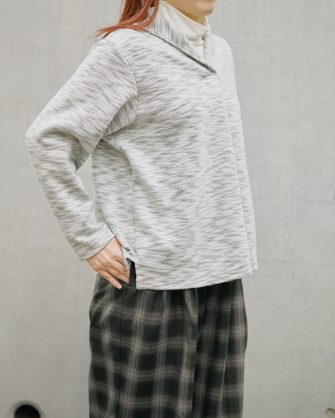 衿は大きすぎないバランスで、肩まわりはゆとりのあるドロップショルダーシルエット。