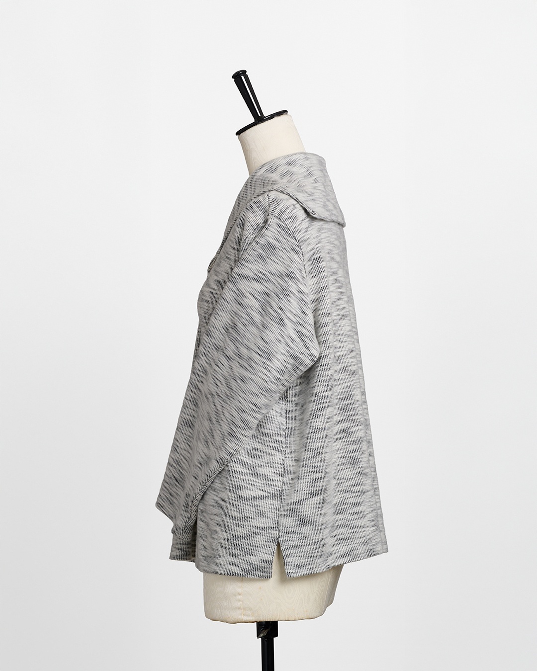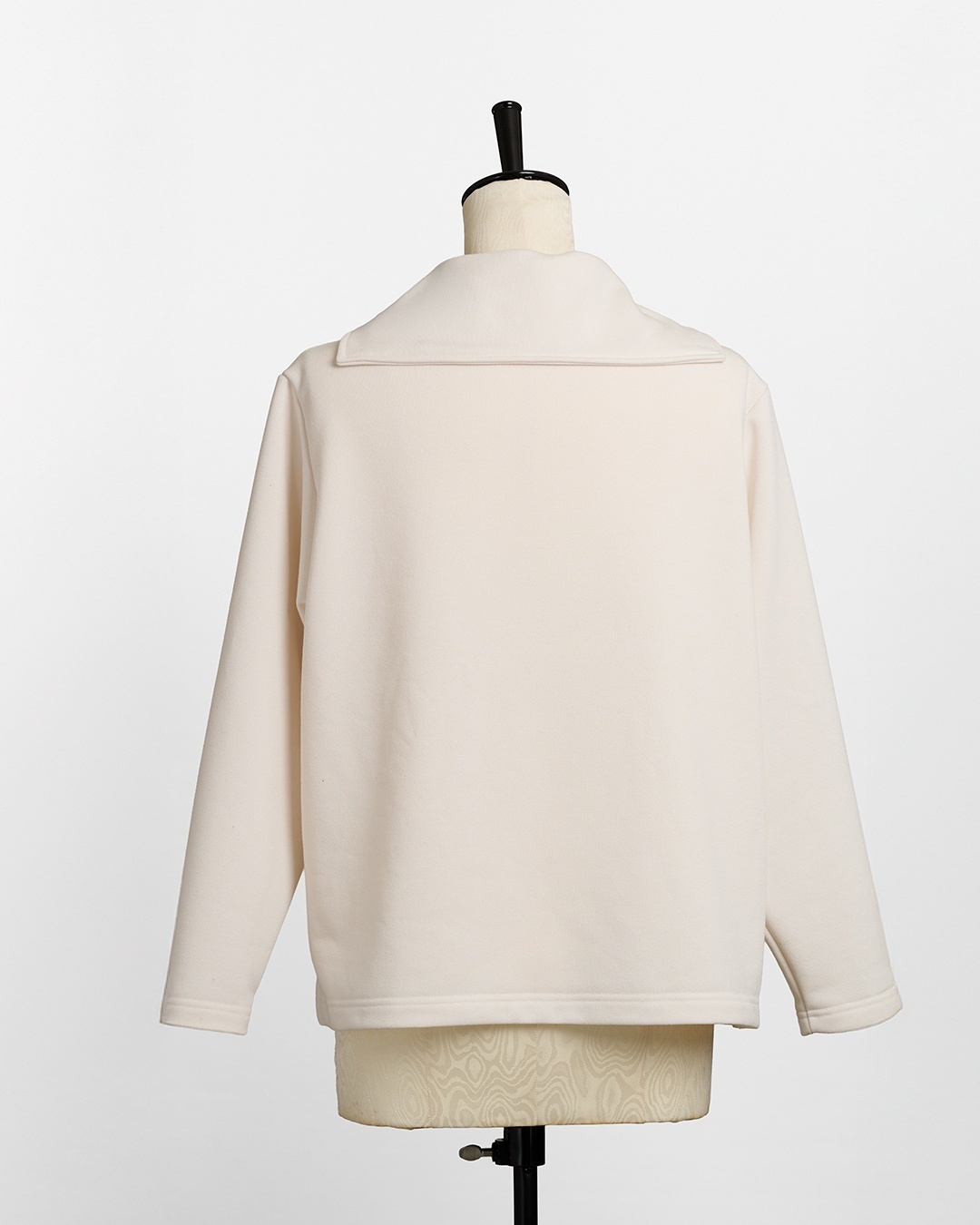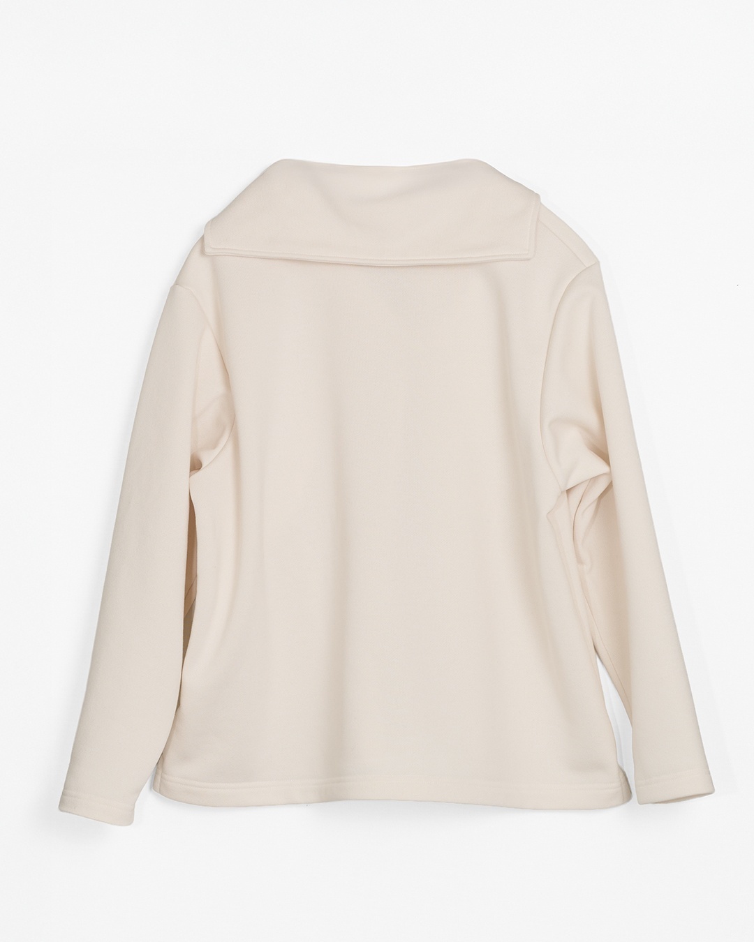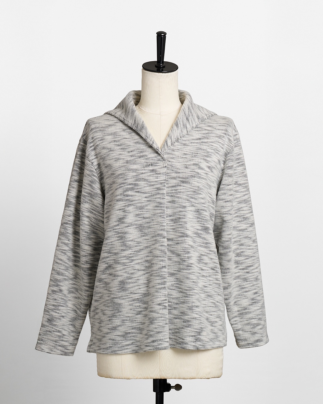 衿は大きすぎないバランスで、肩まわりはゆとりのあるドロップショルダーシルエット。