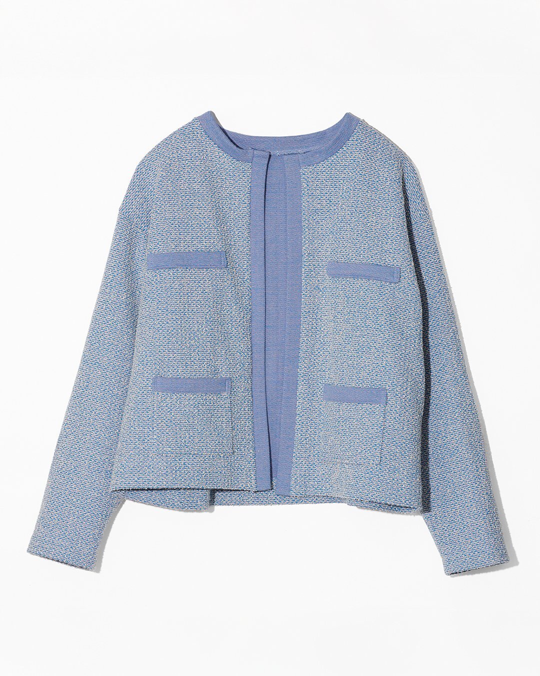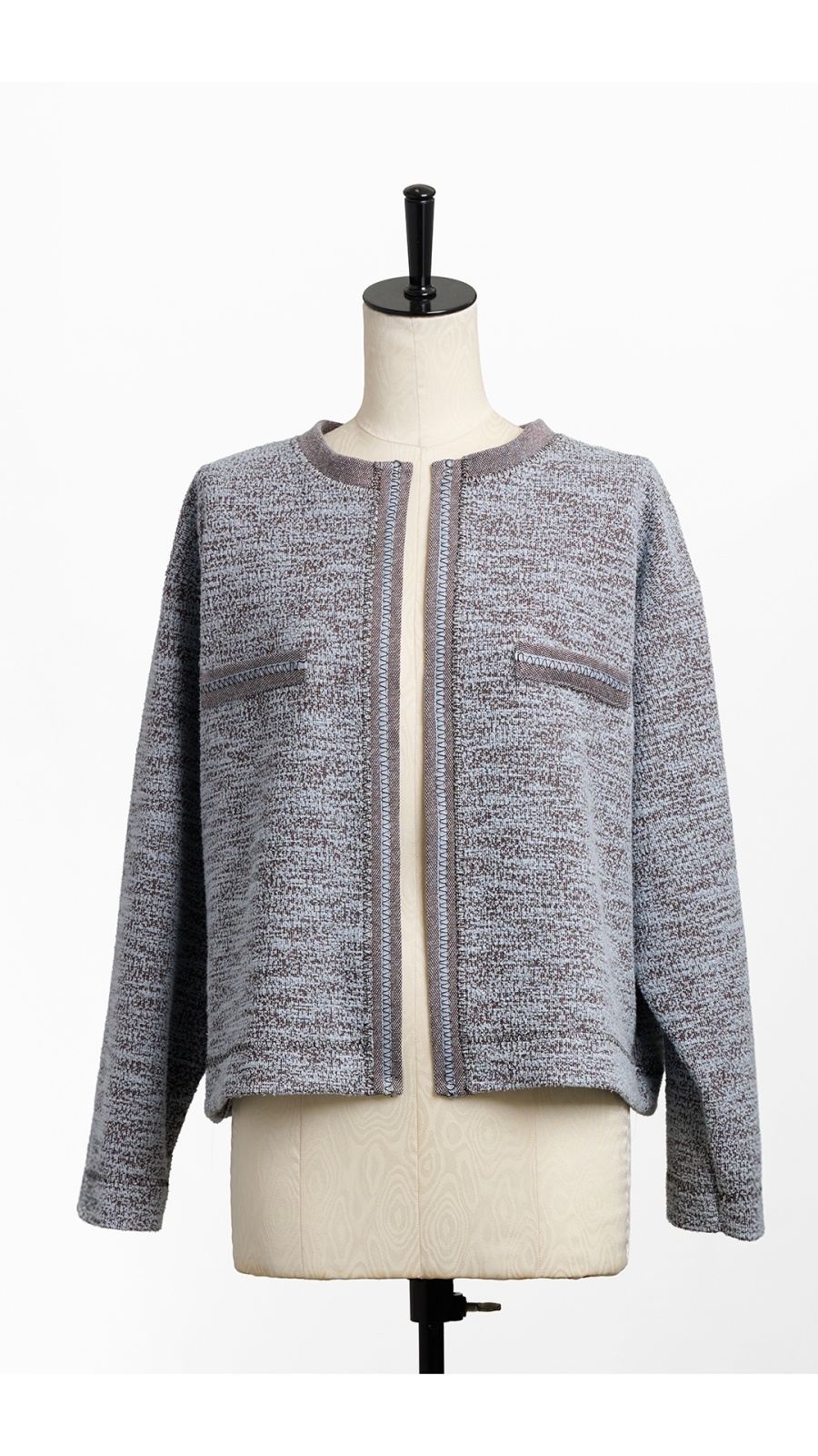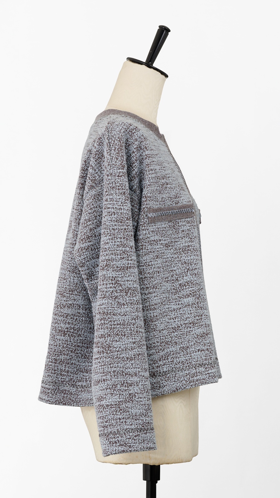 前立て・衿ぐり・ポケット口を配色のように見せることで、上品さとカジュアルさの両方を兼ね備えた一着に仕上がります。